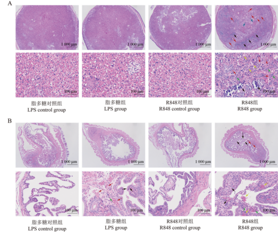 黑色箭头:上皮层结缔组织;红色箭头:血管扩张;黄色箭头:红细胞;绿色箭头:炎性细胞浸润。